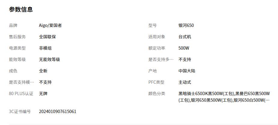 产品名称 : 爱国者银河黑曼巴系列白牌额定500