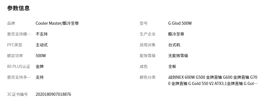 酷冷至尊 G500W 金牌电源